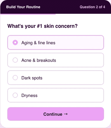 Three questions give you 80% of the personalization value of the full quiz. The "oily + acne + nothing yet" customer sees a starter kit. The "dry + aging + full routine" customer sees a single high-end serum to slot in. The routine-level question prevents you from recommending products she already owns — the fastest way to look out of touch.